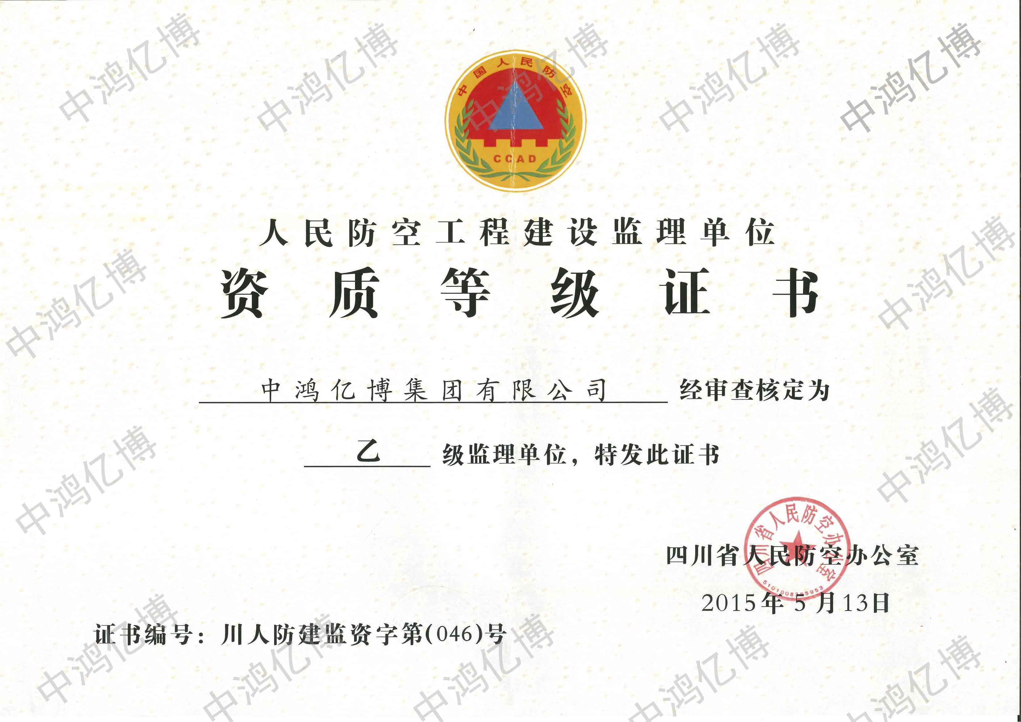 2015年5月取得人防辦頒發(fā)的人民防空工程建設(shè)監(jiān)理單位乙級(jí)資質(zhì)證書